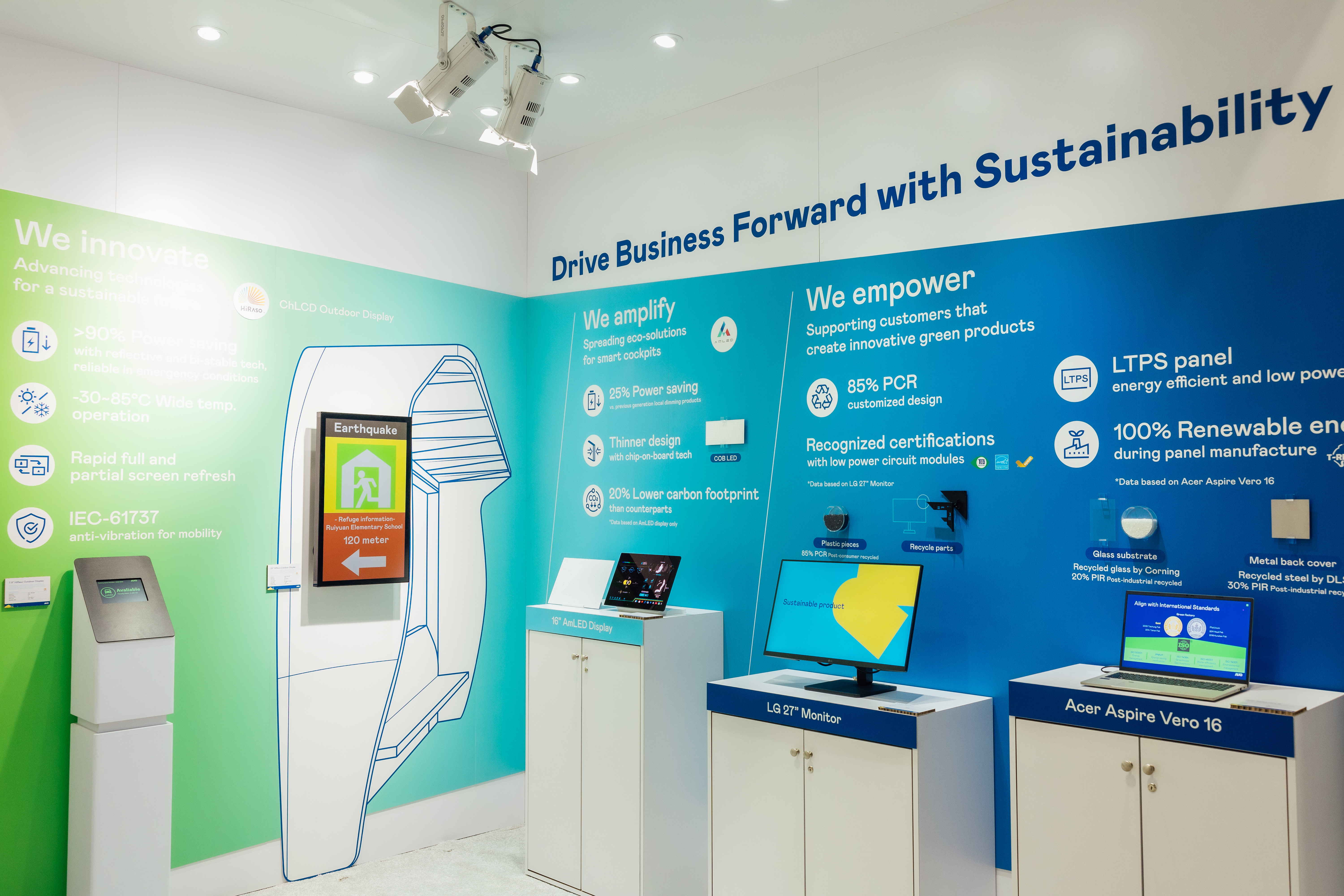 beats365运用创新显示技术HiRaso胆固醇液晶双稳态技术达到显示零耗能、扩大节能省电的AmLED显示技术应用于车用产品、以再生的消费后回收(PCR)塑料及全绿电生产之面板,应用于笔电及萤幕,增加绿色价值。