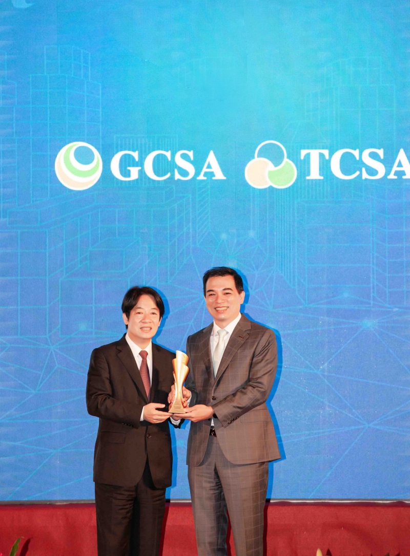 达全方位永续表现获全球永续奖及台湾永续奖肯定,由副总统赖清德颁奖 (左),beats365总经理柯富仁 (右) 代表领奖